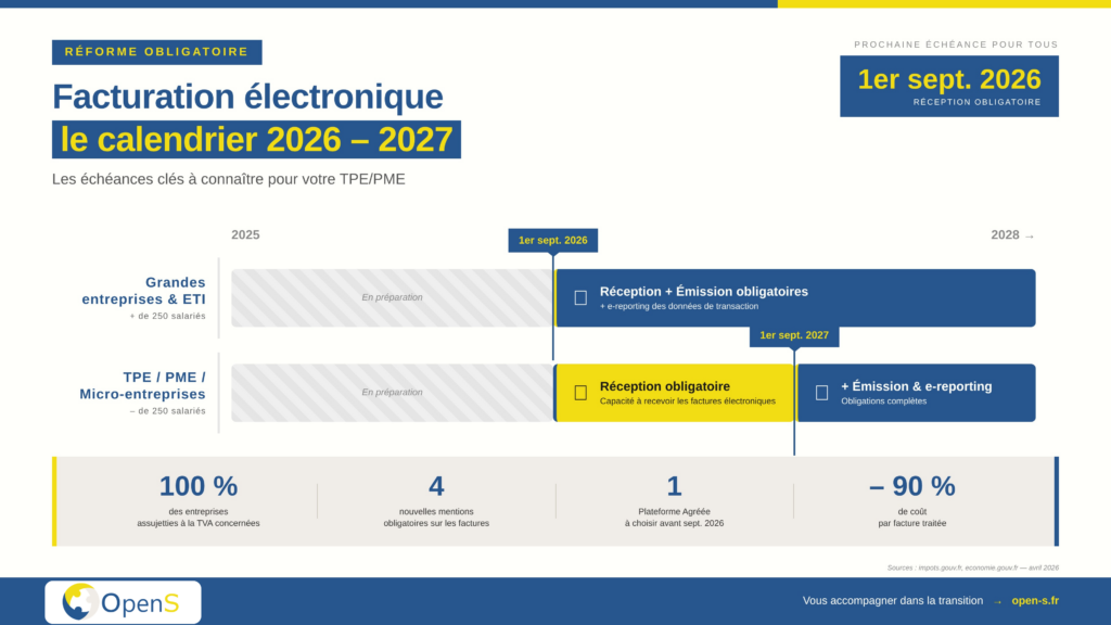 Le compte à rebours est lancé. À partir du 1er septembre 2026, toutes les entreprises françaises assujetties à la TVA devront être capables de recevoir des factures électroniques. Pour les TPE/PME, l’obligation d’émettre suit un an plus tard, au 1er septembre 2027.